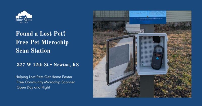 Blue Skies Pet Care is proud to introduce a 24-hour Microchip Scan Station for the Newton, KS community, located at 327 W 12th Street near the main sidewalk at 12th & Ash.